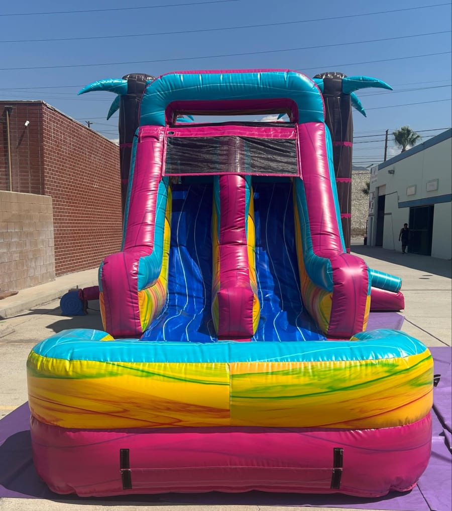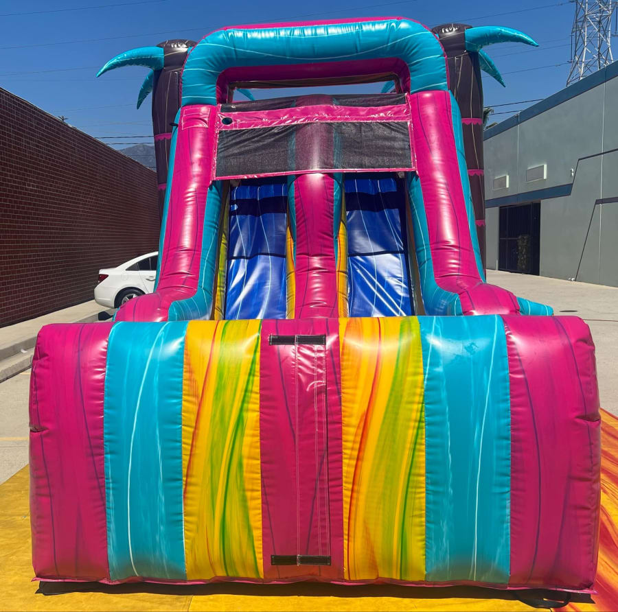 Pink Tropical Combo Wet/Dry adds a splash of tropical fun with its vibrant pink design and cheerful palm trees. This versatile inflatable features a bounce area, climb, slide, and can be used wet or dry. Perfect for any party or gathering, it combines playful aesthetics with dynamic entertainment to create a tropical paradise right in your backyard.