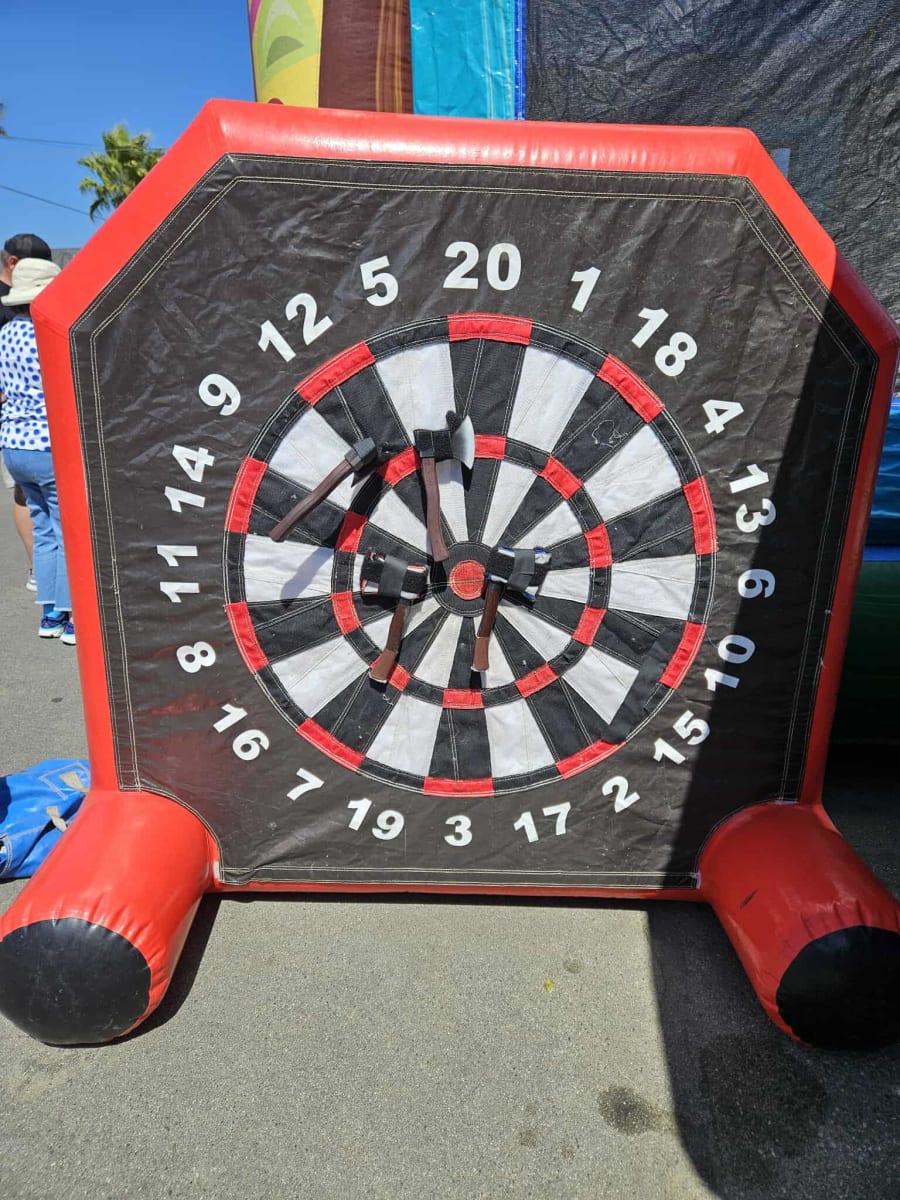 Introducing our Inflatable Axe Throw rental – perfect for any event! Sized at 8 feet wide, 10 feet long, and 8 feet high, it's compact and easy to set up indoors or outdoors. Gather friends or colleagues for some friendly competition and see who can hit the bullseye. Ideal for parties, team building, or just having fun. Book now and add excitement to your next gathering with the Inflatable Axe Throw