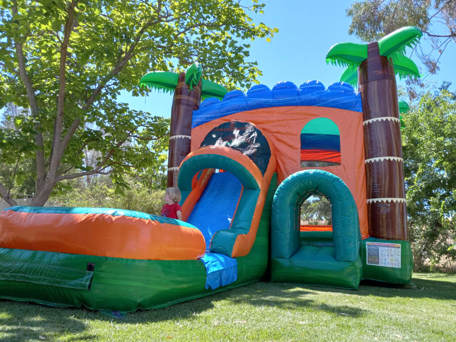 The Tropical Water Slide Combo is the perfect bounce house for any time of the year! Great for any Summertime event or party, this combo jumper comes with a water slide making it fun for anyone. The Tropical Combo has a rock-climbing wall, a Slide which can be used wet or dry and an inflated pool area. The combo also has a new safety tunnel to enter the jumper and a safety net at the top of the slide. No cancellation fees and pay at delivery.