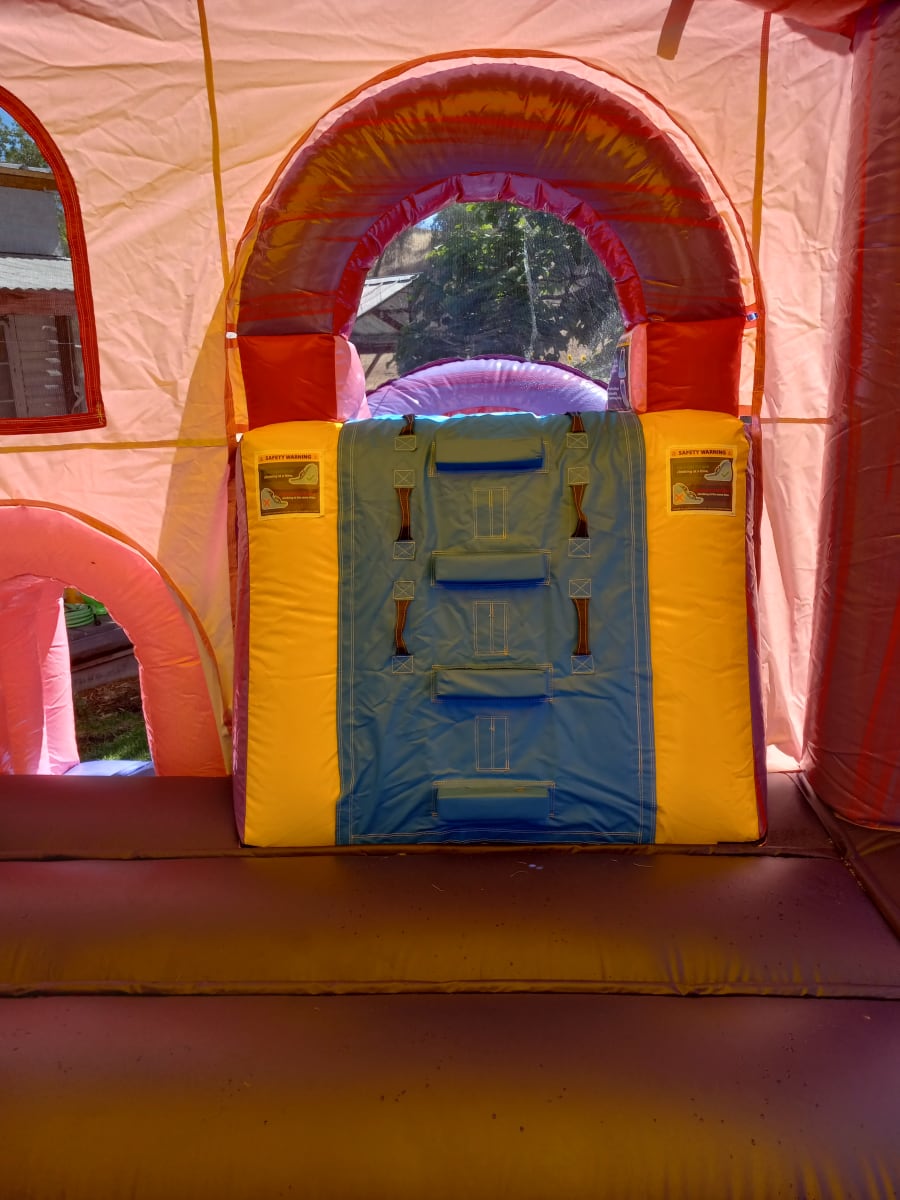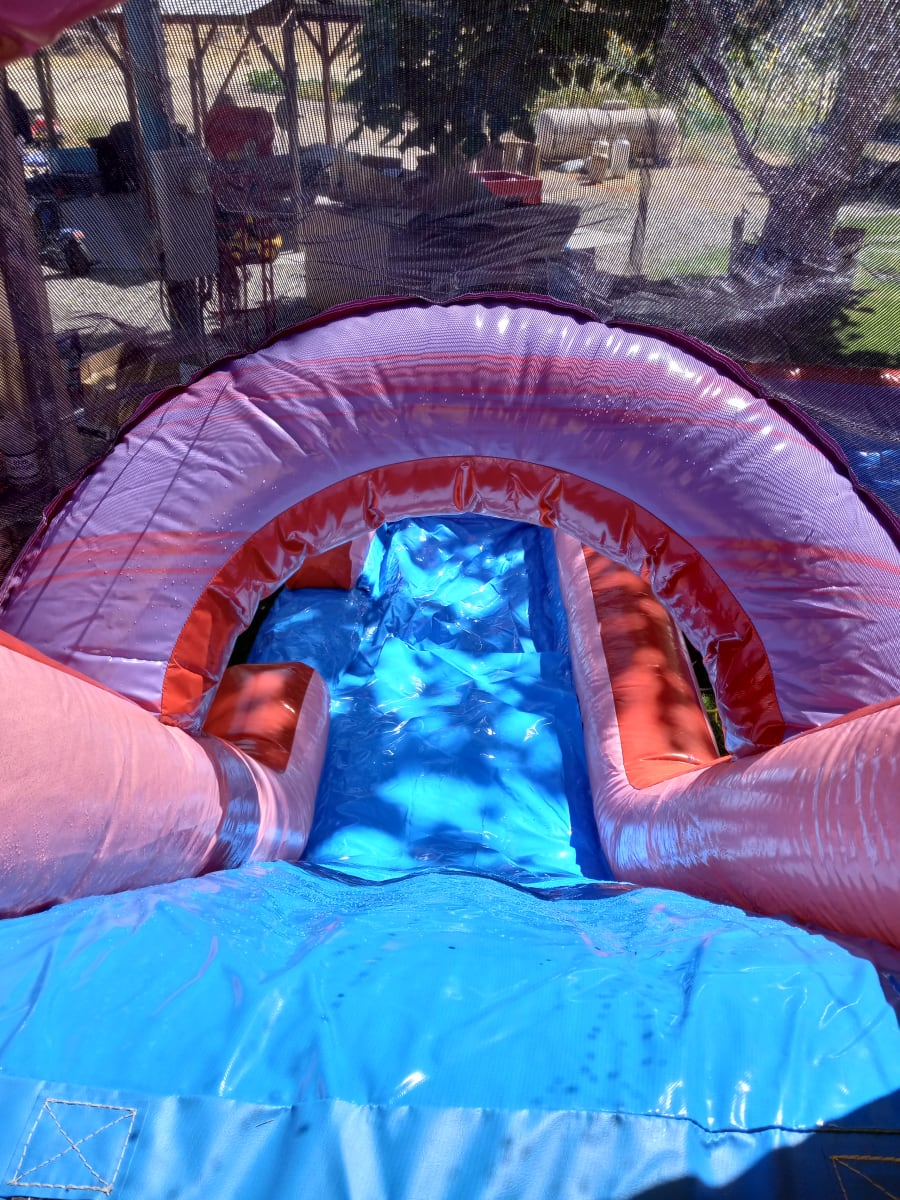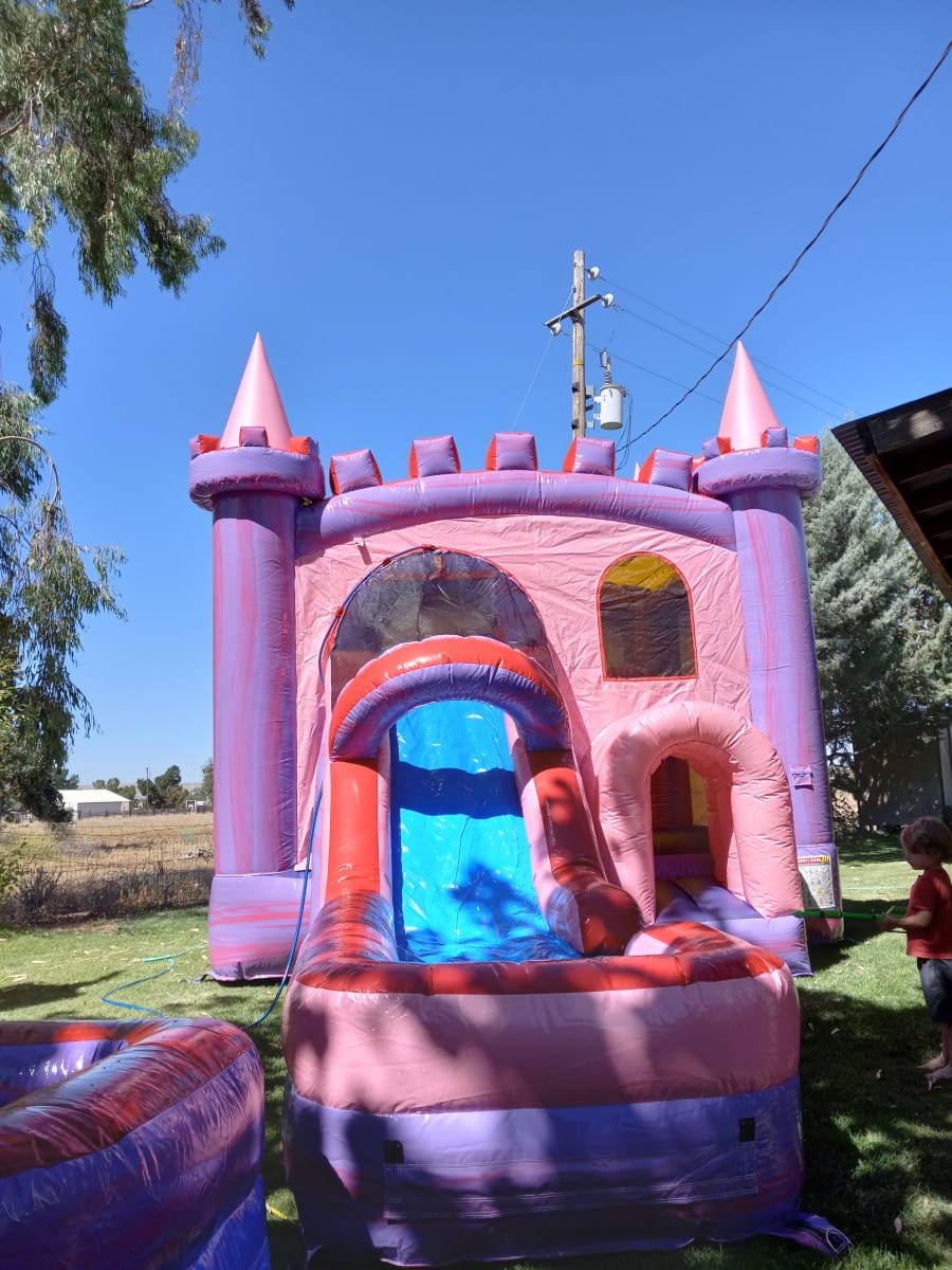 The Pink Castle Combo is the perfect bounce house for any time of the year! Great for any Summertime event or party, this combo jumper comes with a water slide making it fun for anyone. This combo has a rock-climbing wall, a Slide which can be used wet or dry and an inflated pool area. The combo also has a new safety tunnel to enter the jumper and a safety net at the top of the slide. No cancellation fees and pay at delivery.