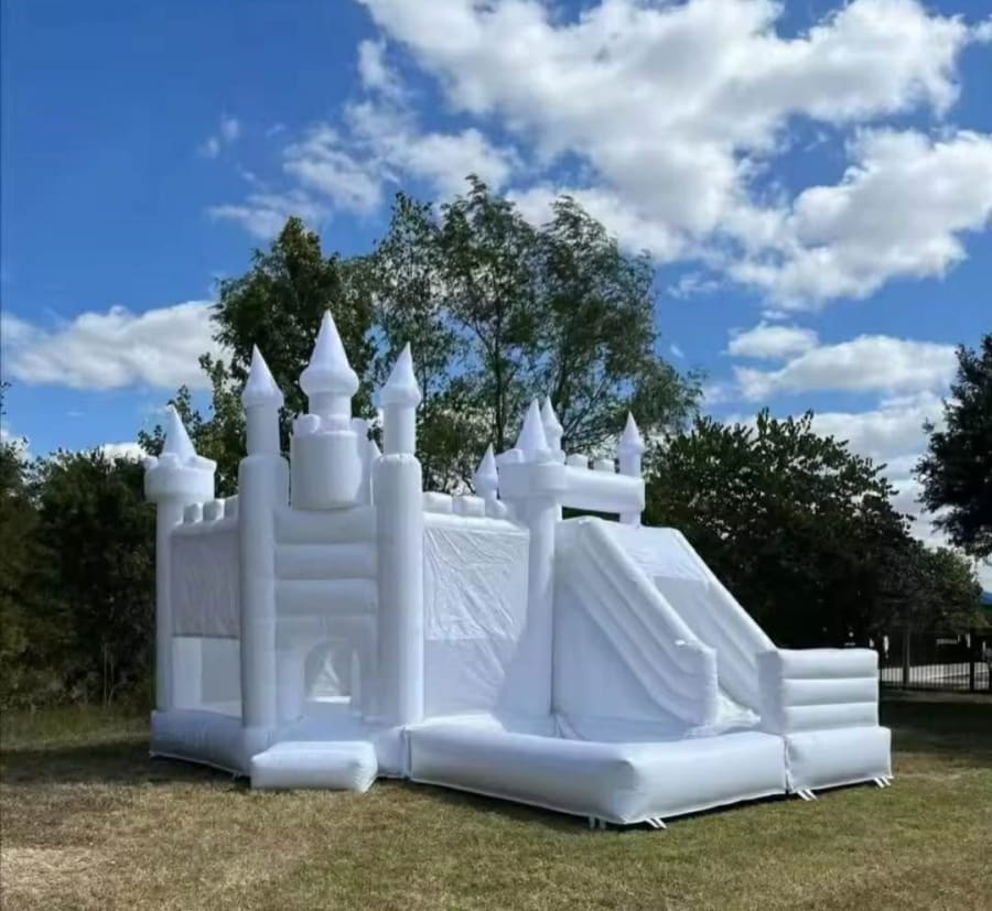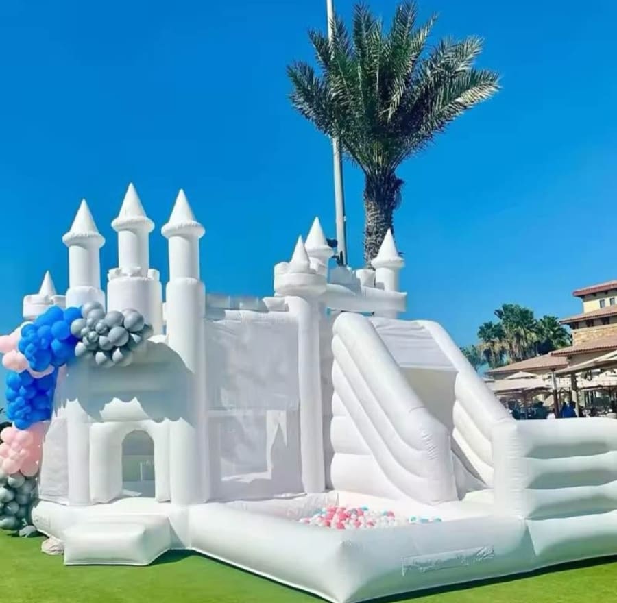 Size: 19 ft x 15 ft Bring elegance and fun to any celebration with our stunning all-white castle combo! This inflatable features a large bounce area and slide, making it perfect for weddings, birthdays, baby showers, and upscale events. Its modern, neutral design fits any theme and looks amazing when decorated with balloons or garlands. 🎉 Features: Spacious bounce area and dry slide Elegant all-white design for any occasion Perfect backdrop for photos and décor Great for both kids and adults 💡 Balls and balloons in images not included. ✨ Add the White Combo Dry to your event and make it unforgettable with Ty’s Bounce Barn!