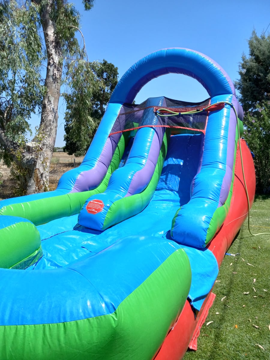 Cool off from the summer heat with the 12' Carnival Water Slide. This slide provides fun and excitement to kids of all ages. With its gender neutral colors, this versatile unit caters to girls, boys, or both. Use this water slide without water on a cool day to create some big smiles or turn on the garden hose on a hot day and coast into wet refreshment! This water slide is fun and very safe, featuring an inflated landing zone with built-in drains that keep the water level low enough for a good time, but safe enough for kids of all ages.