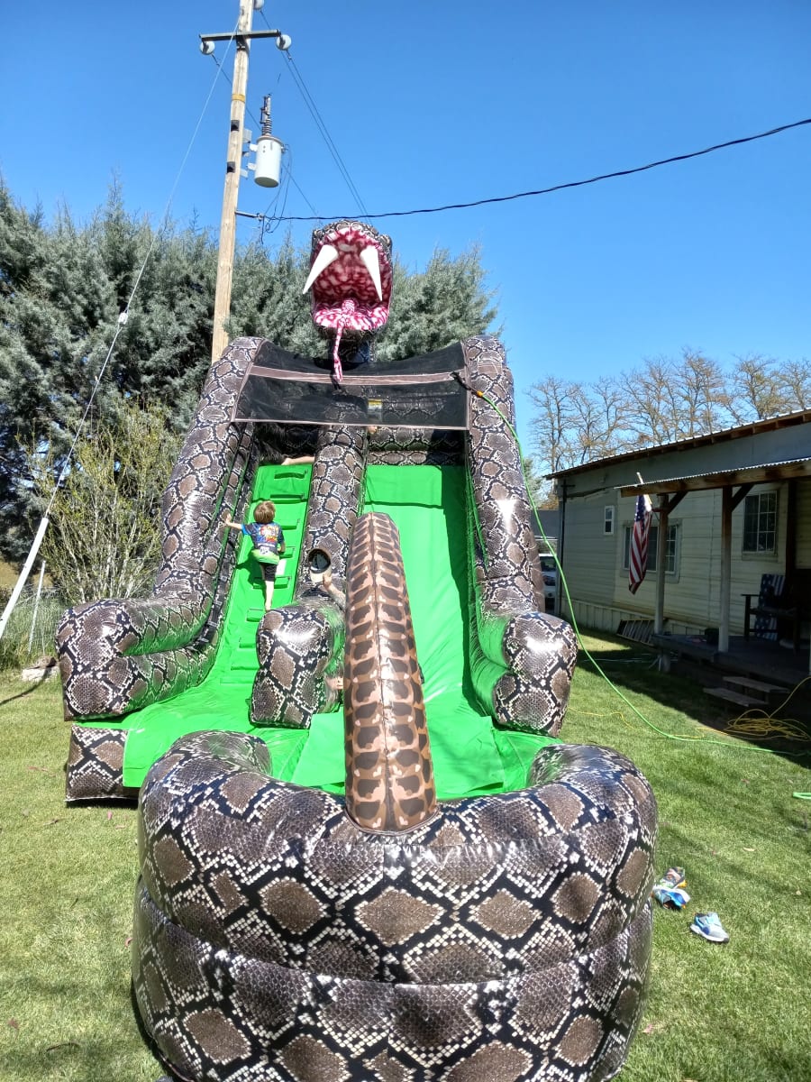 Experience the thrill of the wild with The Rattler - an impressive 16-foot-tall inflatable water slide that's designed to look like a rattle snake! Created by Ty's Bounce Barn, this exciting one of a kind attraction is perfect for any summer party or event. Climb up to the top and hurry down towards the splash pad below before the snake gets you! No cancellation fees and pay at delivery.